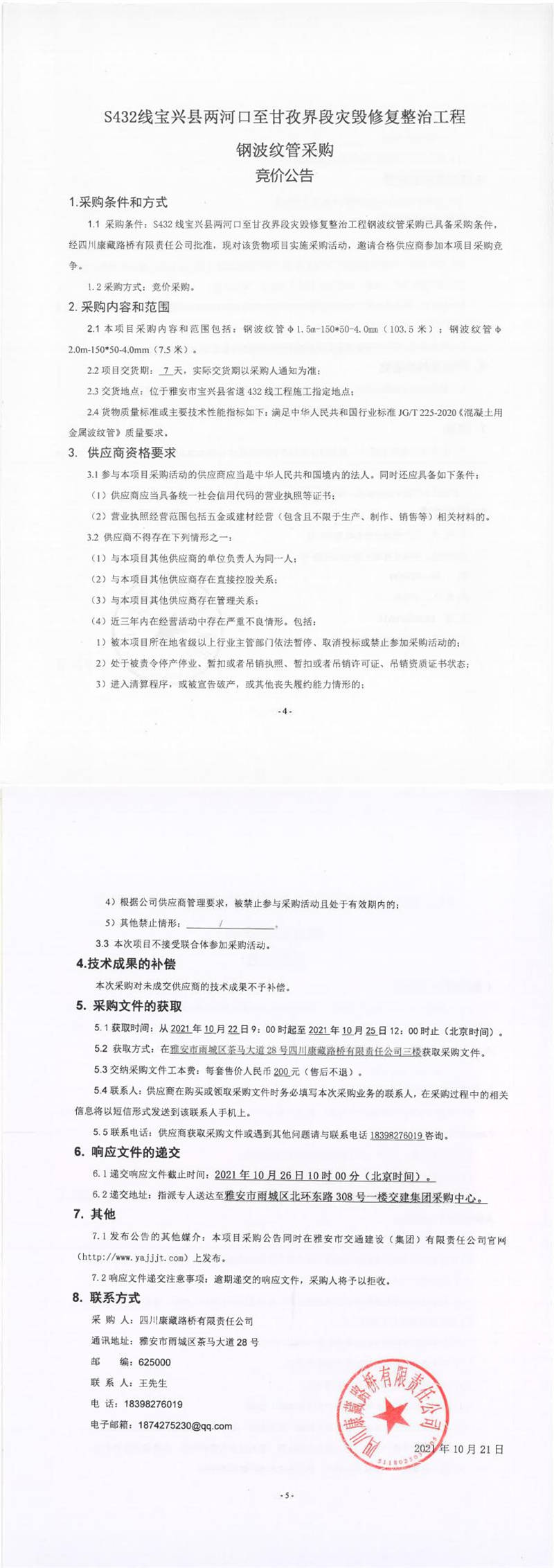 四川康藏路桥有限责任公司S432线宝兴县两河口至甘孜界段灾毁修复整治工程钢波纹管采购竞价公告