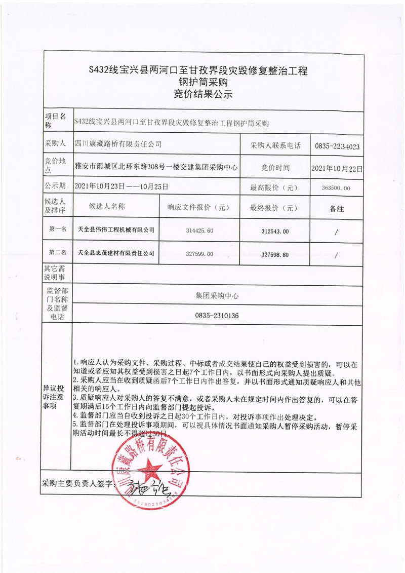 四川康藏路桥有限责任公司S432线宝兴县两河口至甘孜界段灾毁修复整治工程钢护筒采购竞价结果公示