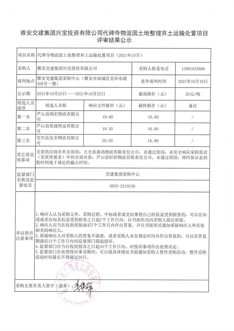 米兰体育-米兰(中国)官网 兴宝投资有限公司代碑寺物流园土地整理弃土运输处置项目评审结果公示