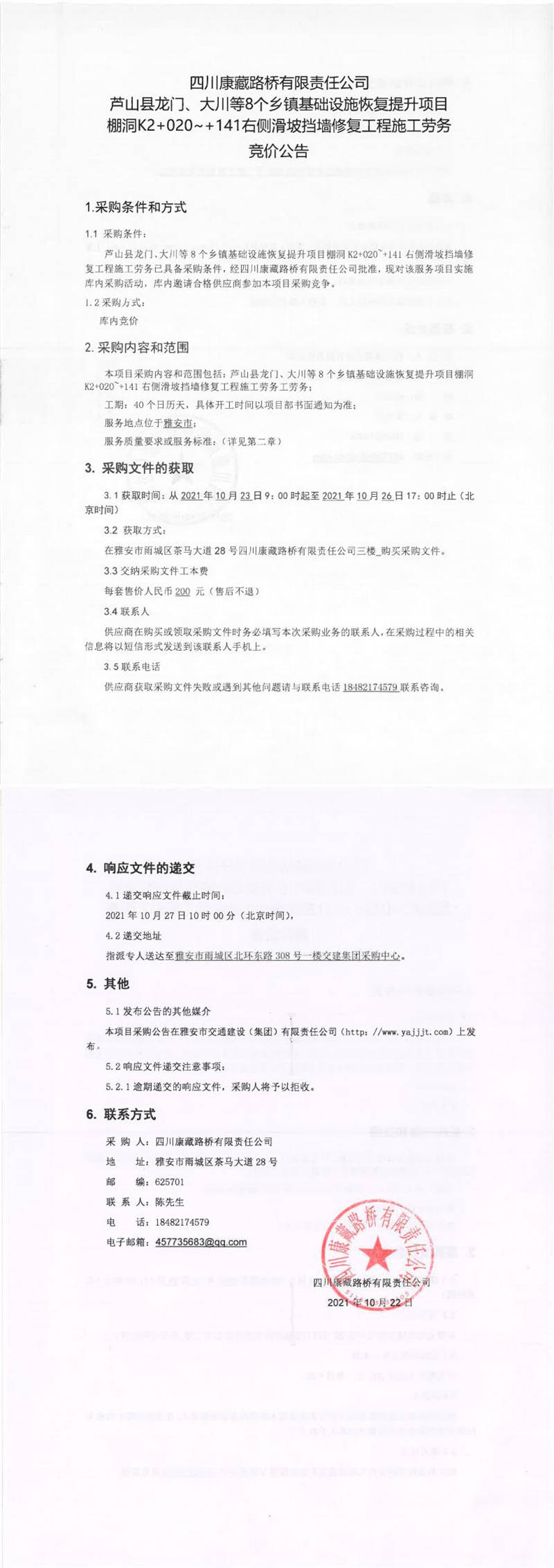 四川康藏路桥有限责任公司芦山县龙门、大川等8个乡镇基础设施恢复提升项目棚洞K2+020~+141右侧滑坡挡墙修复工程施工劳务采购竞价公告