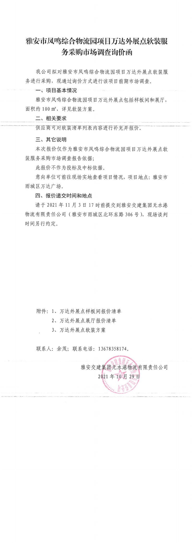 米兰体育-米兰(中国)官网 无水港物流有限责任公司雅安市凤鸣综合物流园项目万达外展点软装服务采购市场调查询价函
