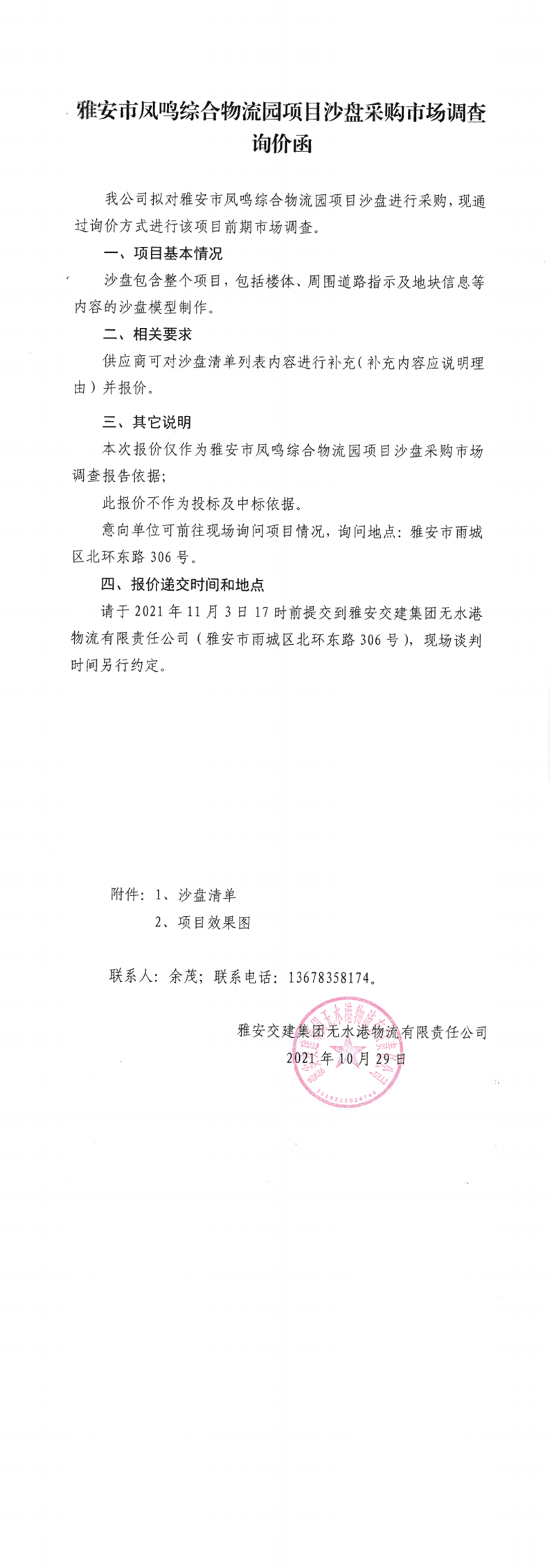 米兰体育-米兰(中国)官网 无水港物流有限责任公司雅安市凤鸣综合物流园项目沙盘采购市场调查询价函