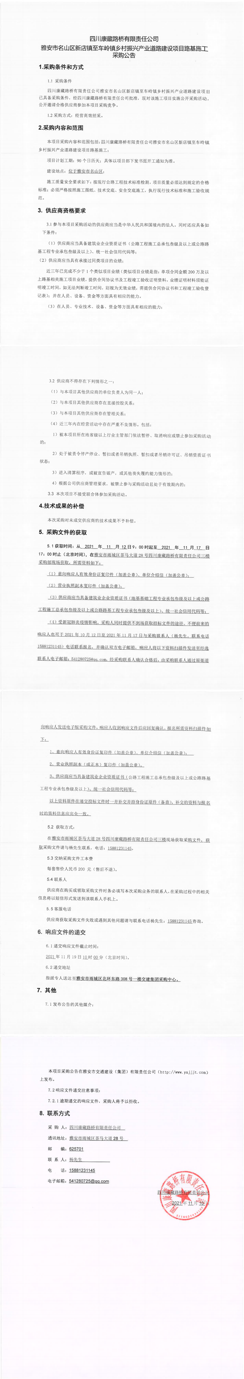 四川康藏路桥有限责任公司雅安市名山区新店镇至车岭镇乡村振兴产业道路建设项目路基施工采购公告