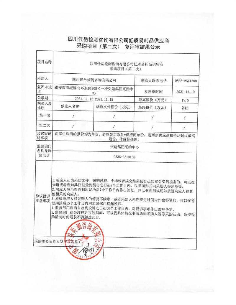 四川佳岳检测咨询有限公司低质易耗品供应商采购项目(第二次)复评审结果公示