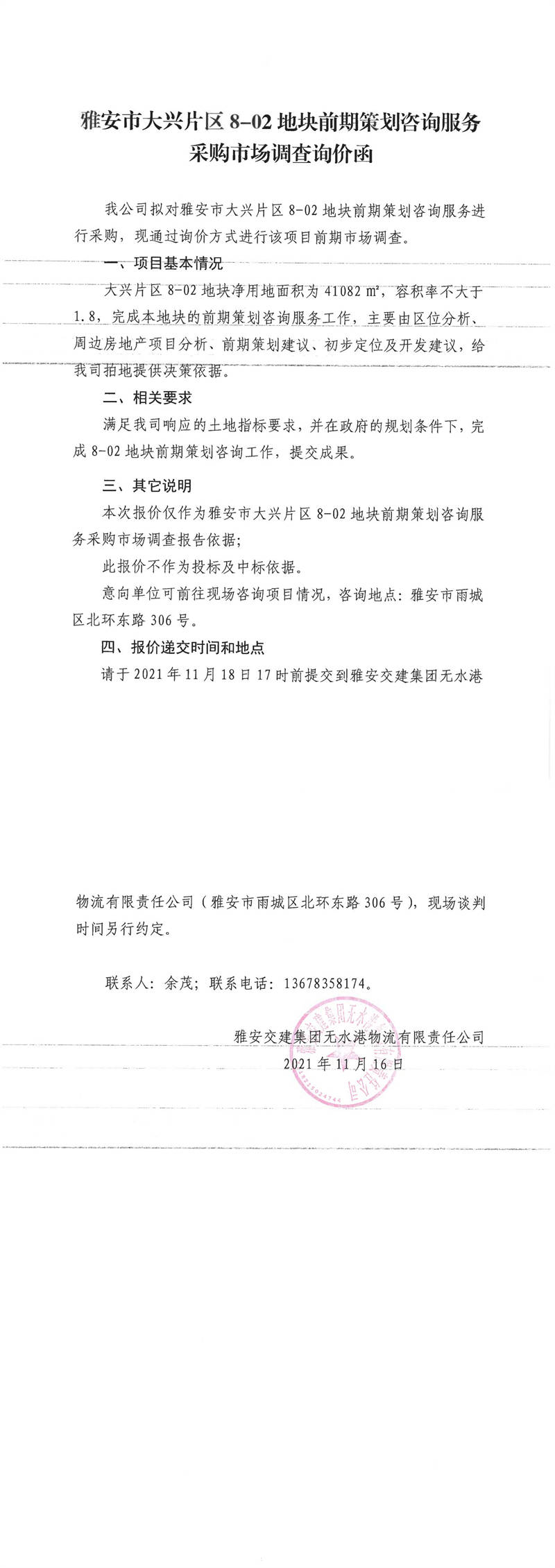 米兰体育-米兰(中国)官网 无水港物流有限责任公司雅安市大兴片区8-02地块前期策划咨询服务采购市场调查询价函