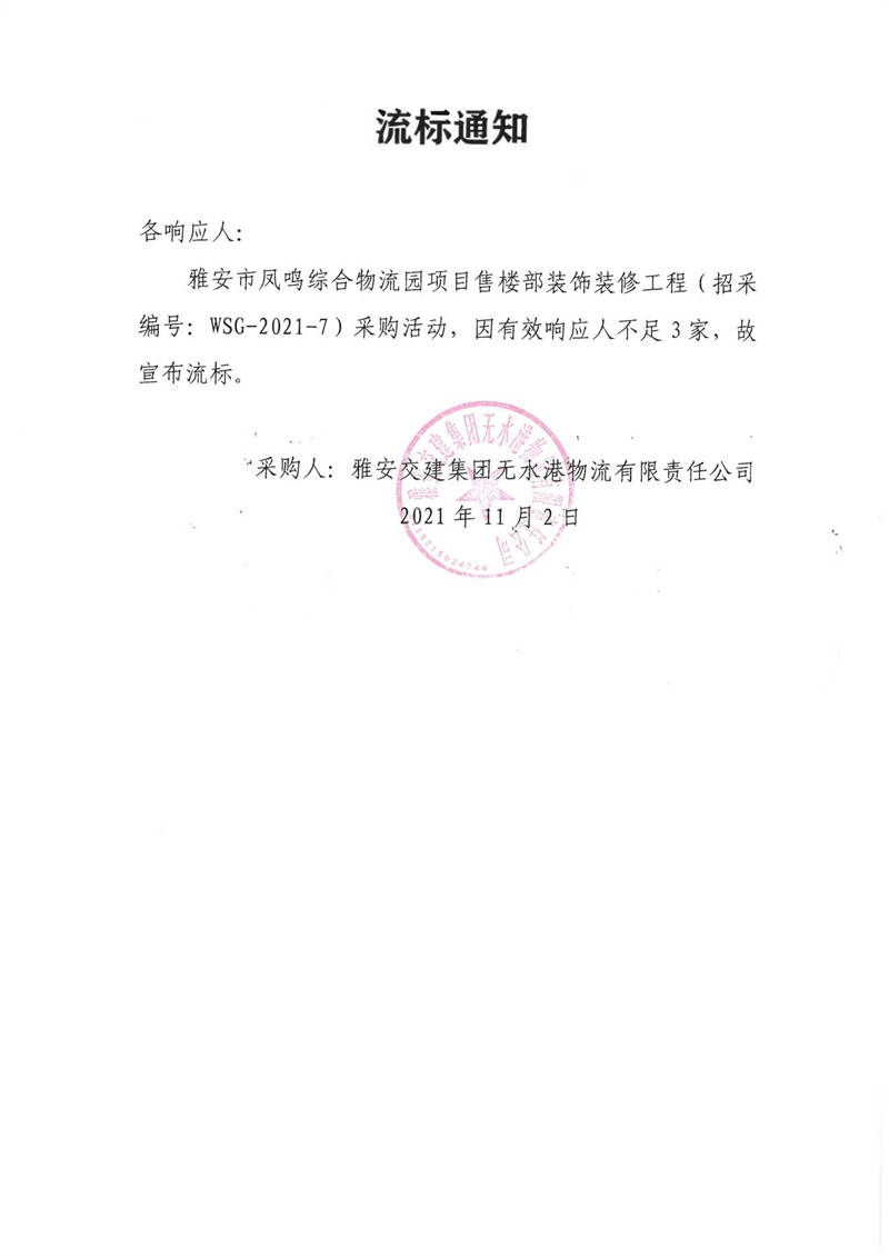 米兰体育-米兰(中国)官网 无水港物流有限责任公司雅安市凤鸣综合物流园项目售楼部装饰装修工程采购流标通知