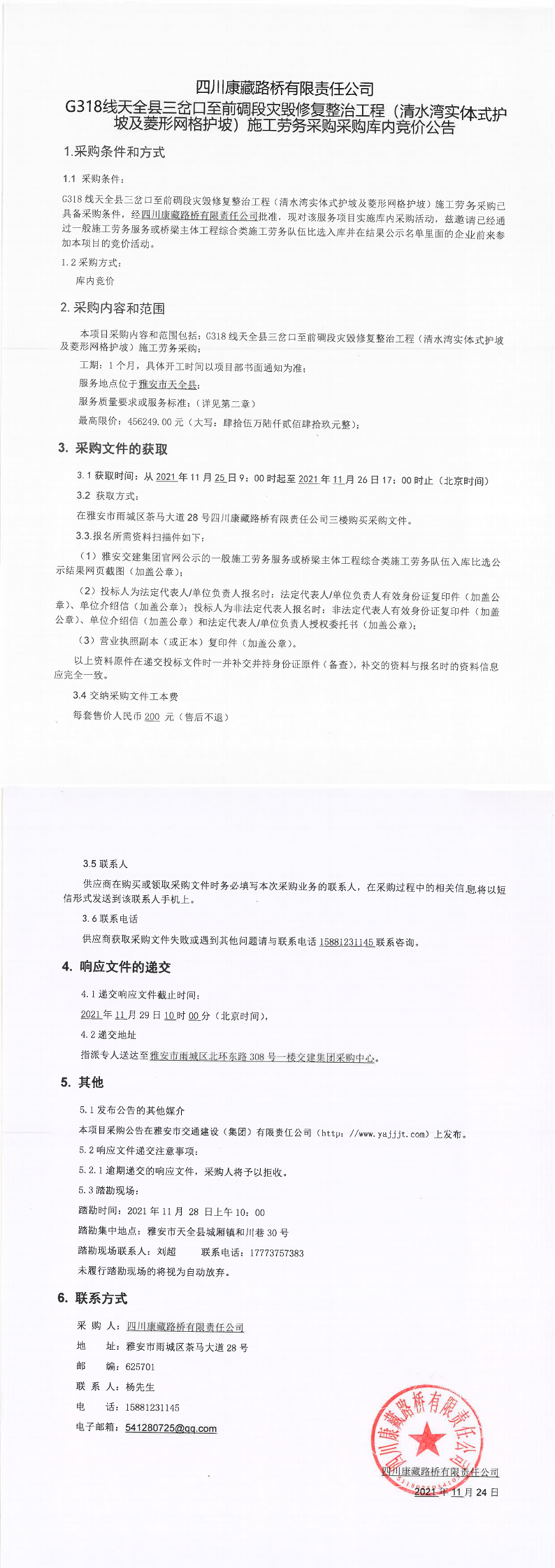 四川康藏路桥有限责任公司G318线天全县三岔口至前碉段灾毁修复整治工程(清水湾实体式护坡及菱形网格护坡)施工劳务采购采购库内竞价公告
