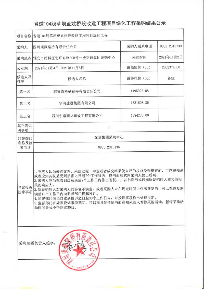 四川康藏路桥有限责任公司省道104线草坝至姚桥段改建工程项目绿化工程采购结果公示