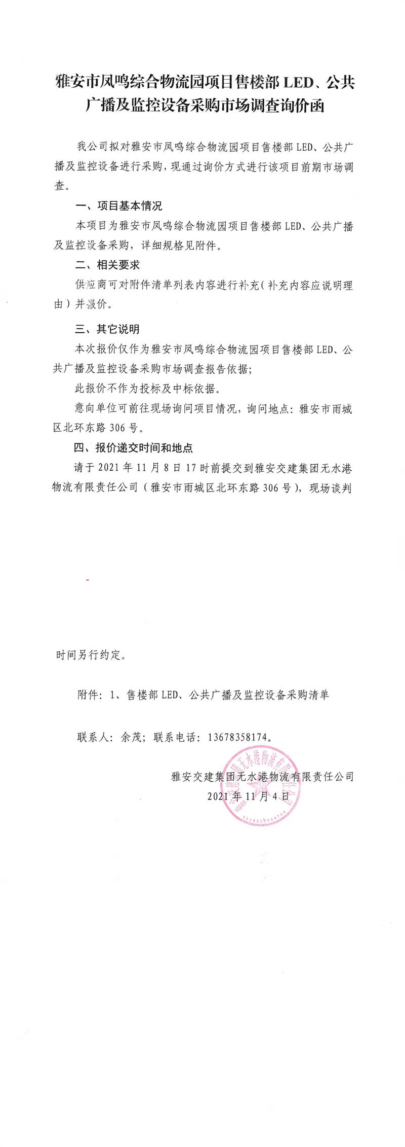 米兰体育-米兰(中国)官网 无水港物流有限责任公司雅安市凤鸣综合物流园项目售楼部LED、公共广播及监控设备采购市场调查询价函