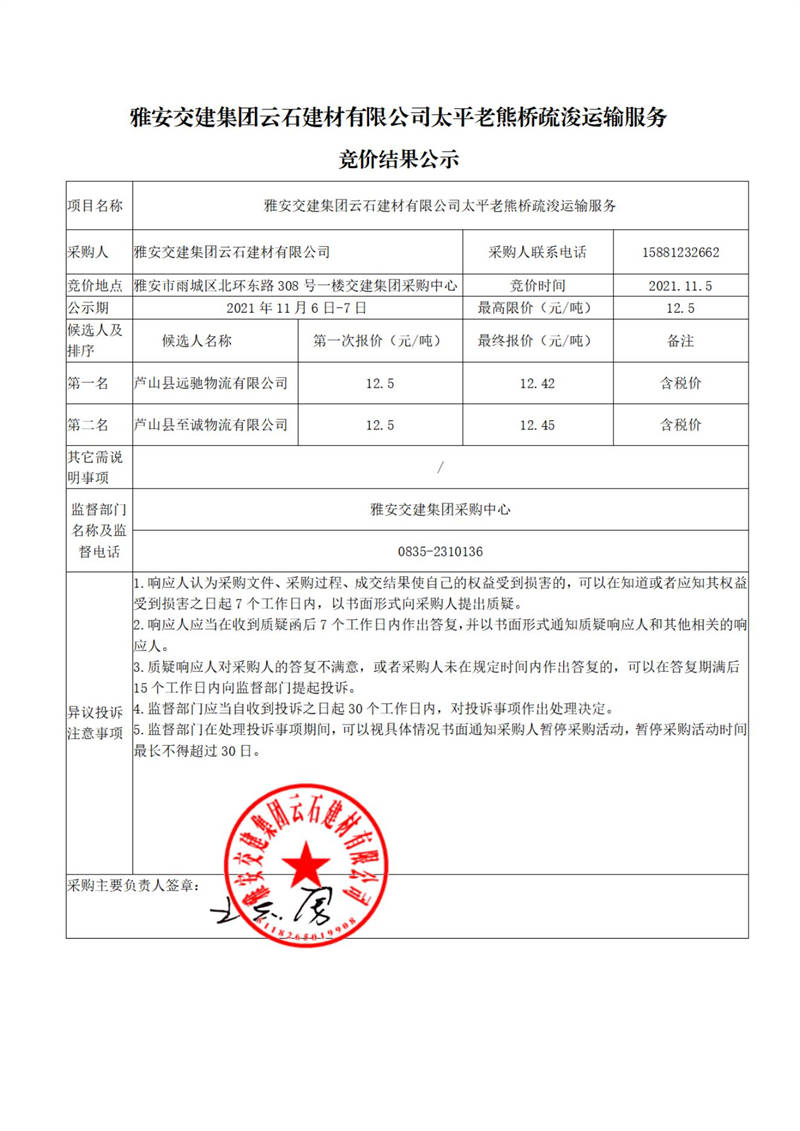 米兰体育-米兰(中国)官网 云石建材有限公司太平老熊桥疏浚运输服务竞价结果公示