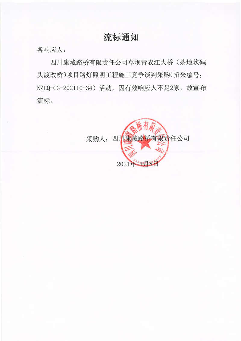 四川康藏路桥有限责任公司草坝青衣江大桥(茶地坎码头渡改桥)项目路灯照明工程施工流标通知