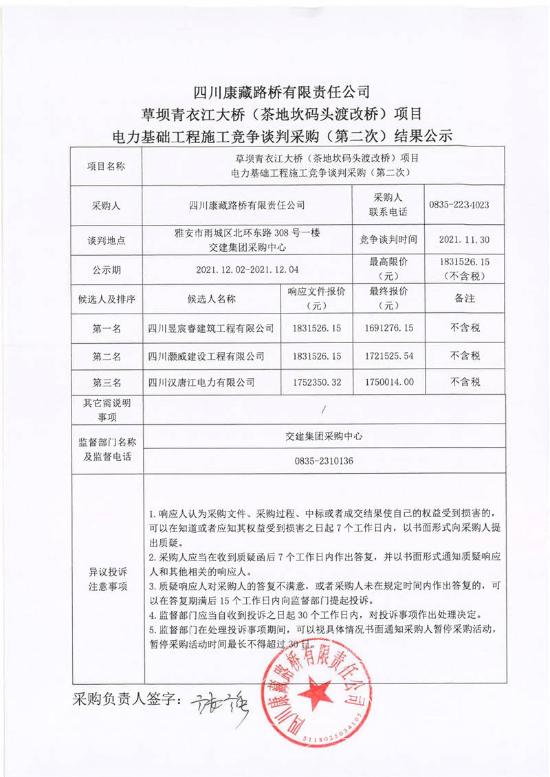 四川康藏路桥有限责任公司草坝青衣江大桥(茶地坎码头渡改桥)项目电力基础工程施工竞争谈判采购(第二次)结果公示