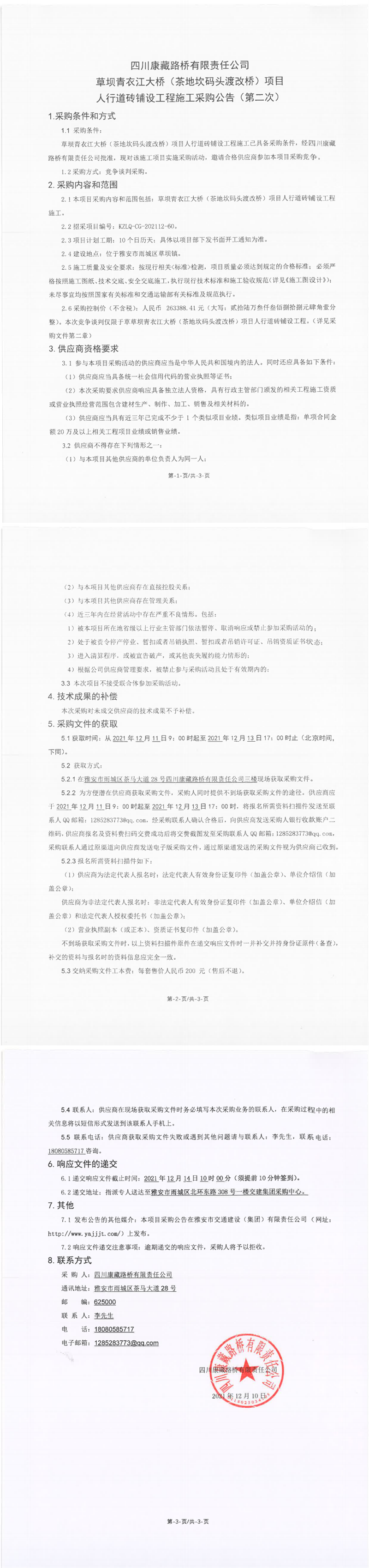 四川康藏路桥有限责任公司草坝青衣江大桥(茶地坎码头渡改桥)项目人行道砖铺设工程施工采购公告(第二次)