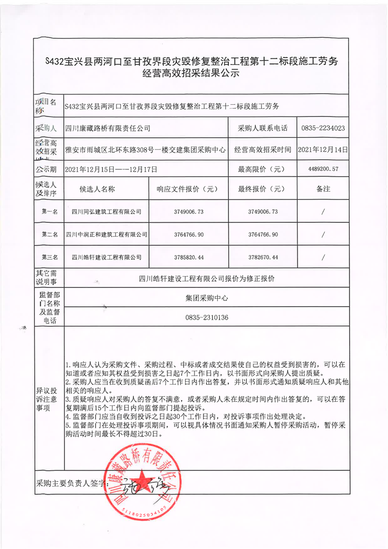 四川康藏路桥有限责任公司S432线宝兴县两河口至甘孜界段灾毁修复整治工程第十二标段施工劳务经营高效招采结果公示