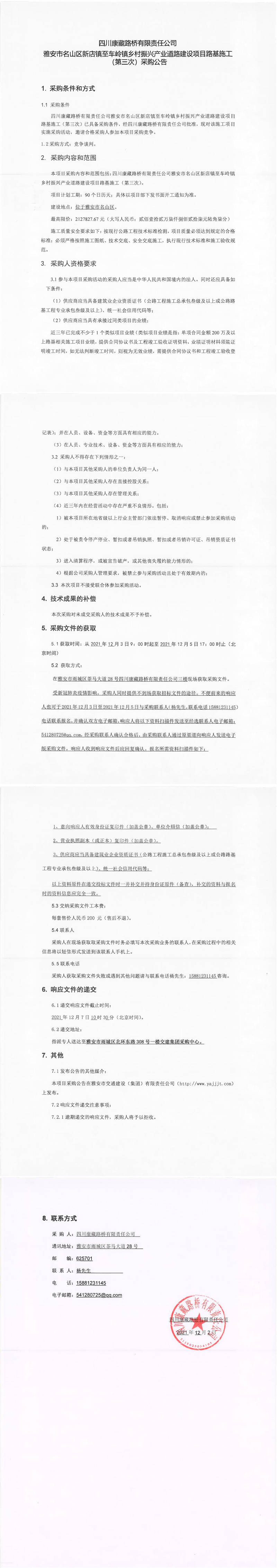 四川康藏路桥有限责任公司雅安市名山区新店镇至车岭镇乡村振兴产业道路建设项目路基施工(第三次)采购公告