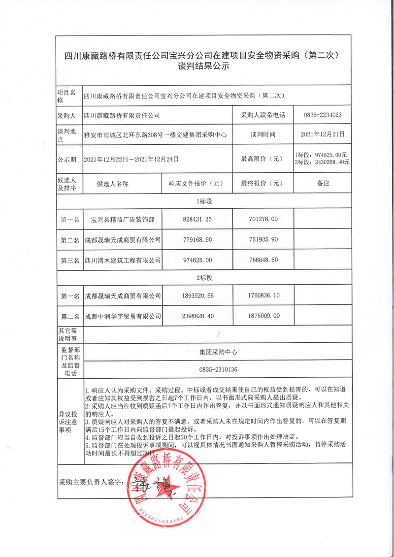 四川康藏路桥有限责任公司宝兴分公司在建项目安全物资采购(第二次)谈判结果公示