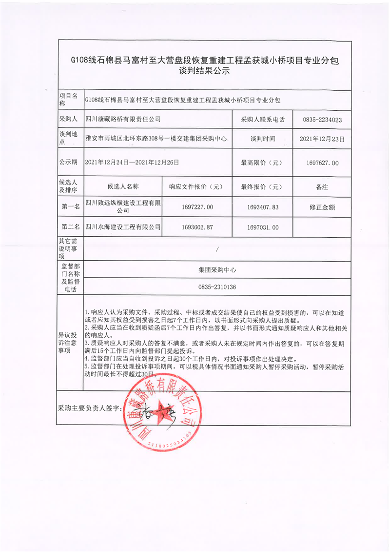 四川康藏路桥有限责任公司G108线石棉县马富村至大营盘段恢复重建工程孟获城小桥项目专业分包谈判结果公示
