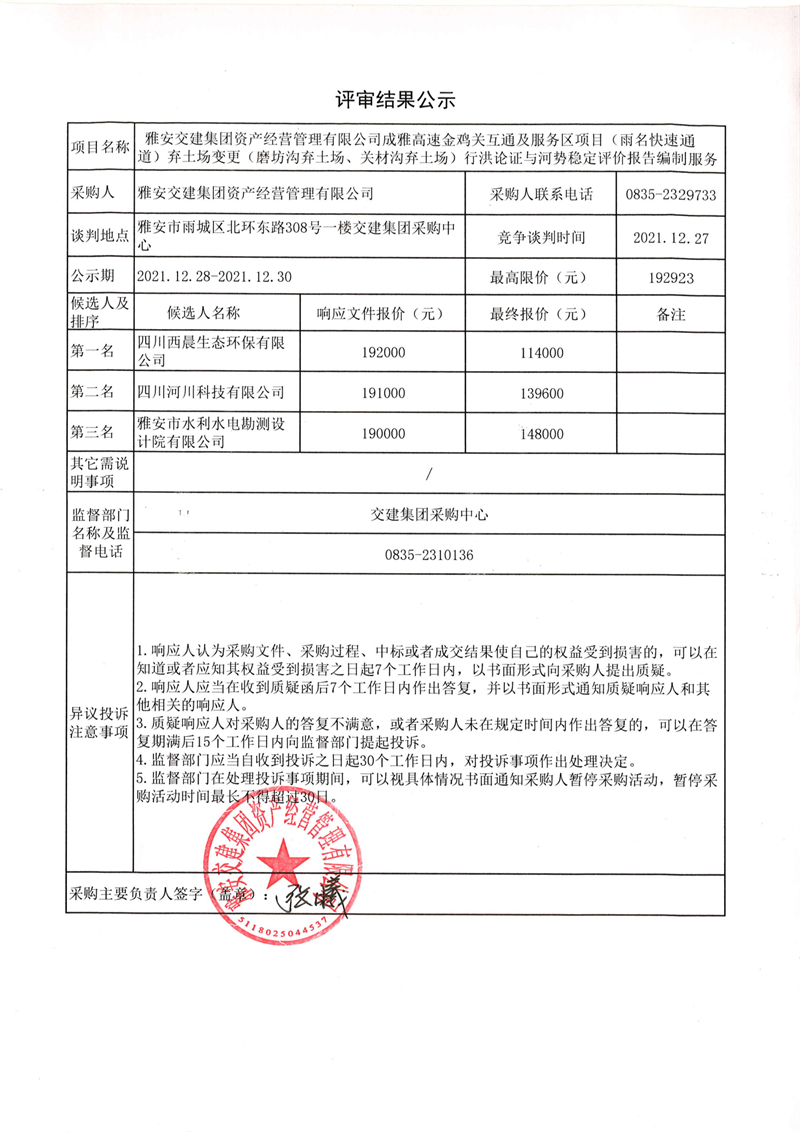 米兰体育-米兰(中国)官网 资产经营管理有限公司成雅高速金鸡关互通及服务区项目(雨名快速通道)弃土场变更(磨坊沟弃土场、关材沟弃土场)行洪论证与河势稳定评价报告编制服务评审结果公示
