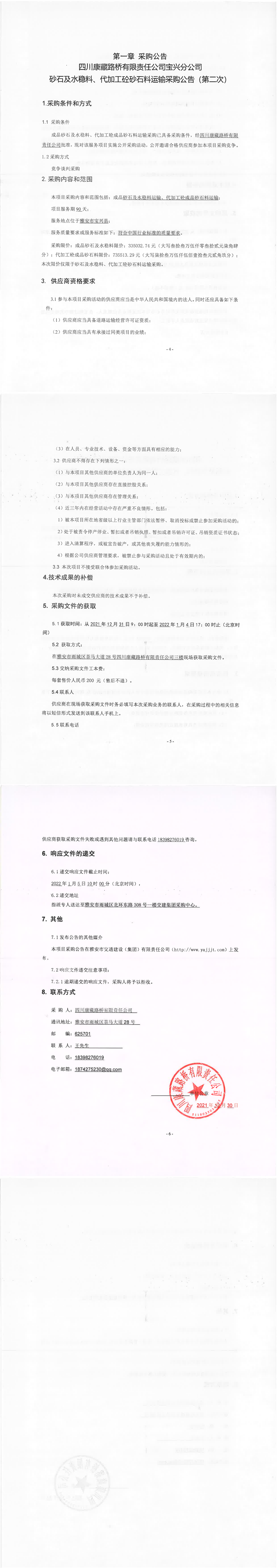 四川康藏路桥有限责任公司宝兴分公司砂石及水稳料、代加工砼砂石料运输采购公告(第二次)