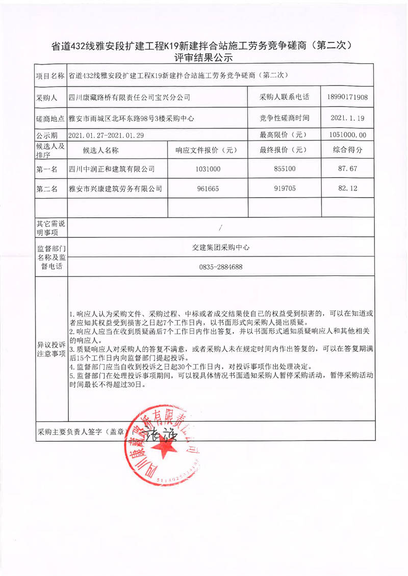 四川康藏路桥有限责任公司宝兴分公司省道432线雅安段扩建工程K19新建拌合站施工劳务竞争磋商(第二次)评审结果公示