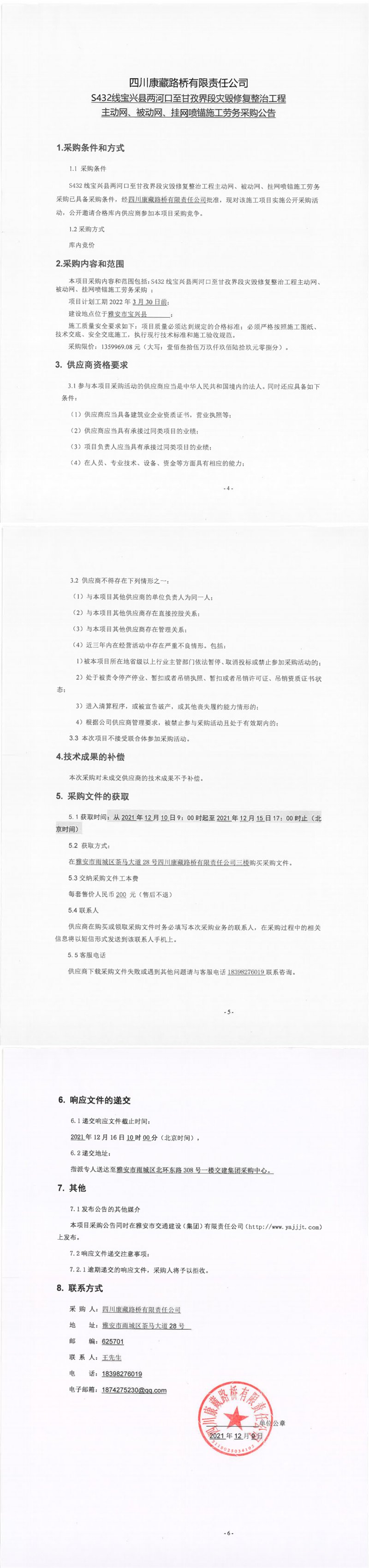 四川康藏路桥有限责任公司S432线宝兴县两河口至甘孜界段灾毁修复整治工程主动网、被动网、挂网喷锚施工劳务采购公告