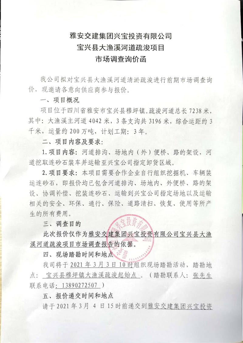 宝兴县大渔溪河道疏浚项目市场调查询价函