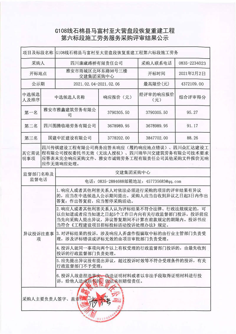 四川康藏路桥有限责任公司G108线石棉县马富村至大营盘段恢复重建工程第六标段施工劳务服务采购评审结果公示