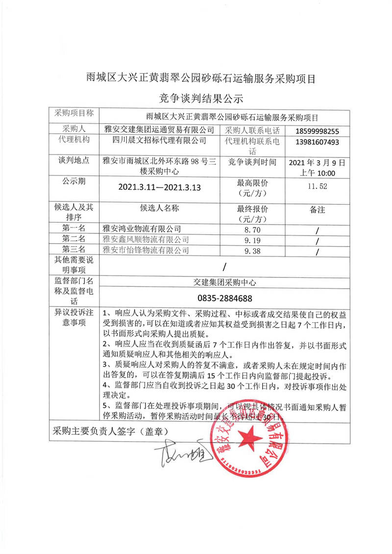 米兰体育-米兰(中国)官网 运通贸易有限公司雨城区大兴正黄翡翠公园砂砾石运输服务采购项目竞争谈判结果公示