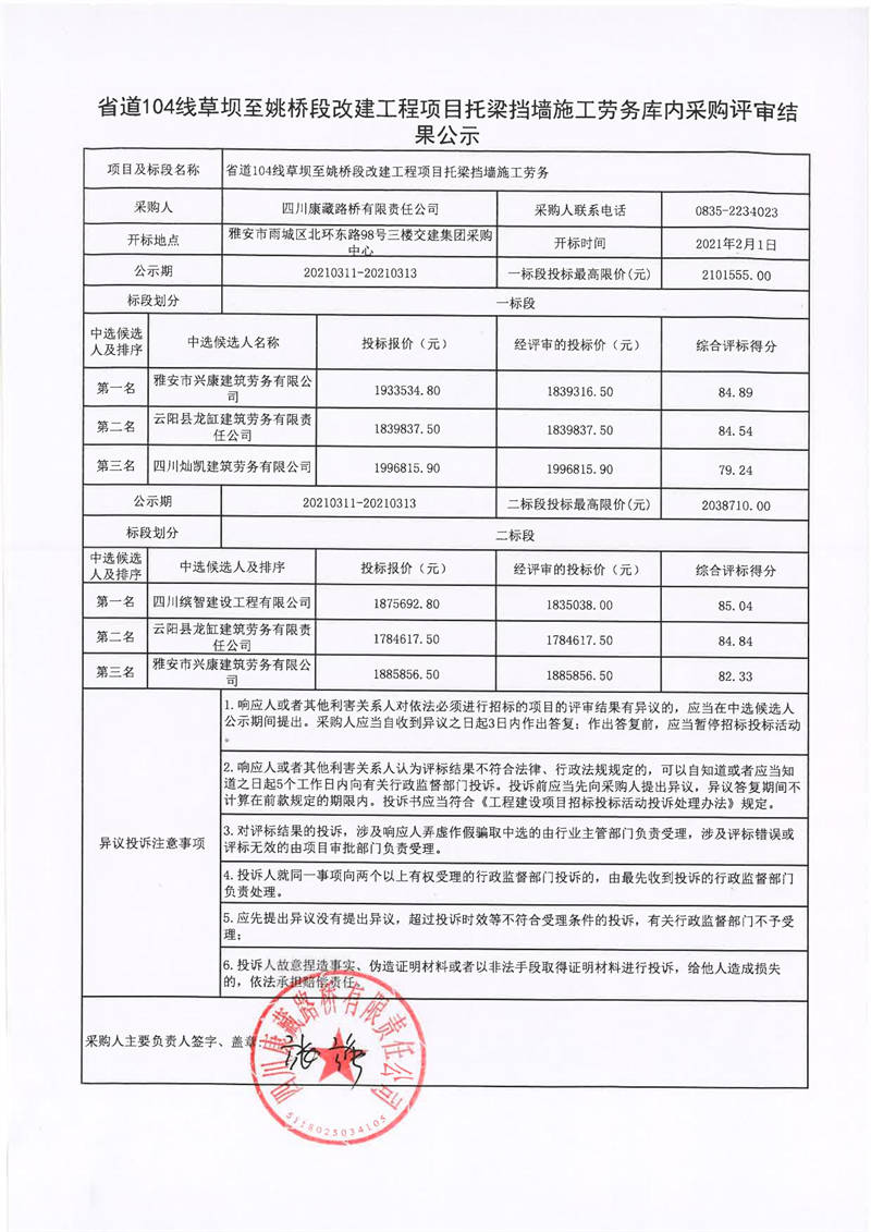 四川康藏路桥有限责任公司省道104线草坝至姚桥段改建工程项目托梁挡墙施工劳务库内采购评审结果公示