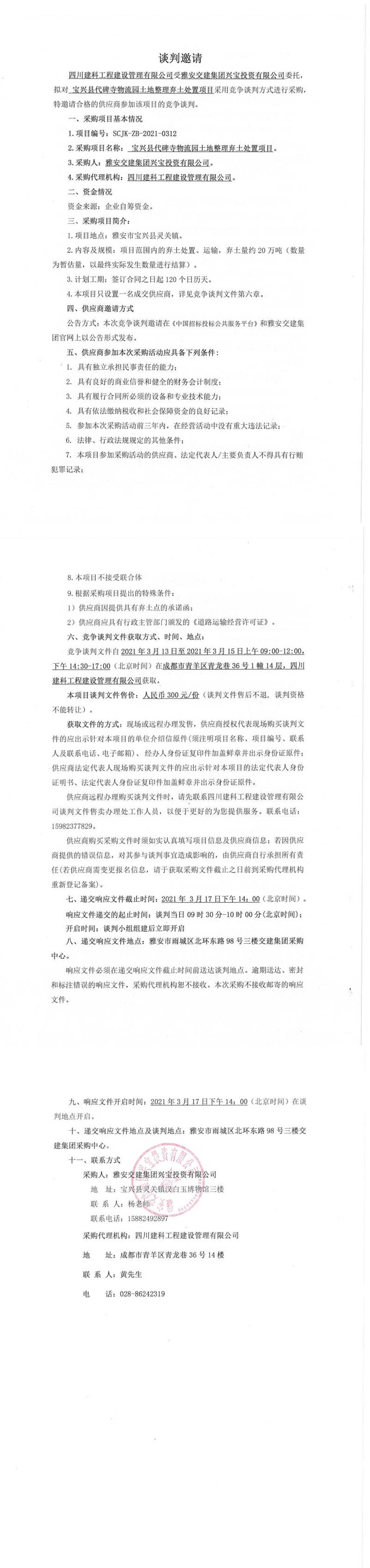 米兰体育-米兰(中国)官网 兴宝投资有限公司宝兴县代碑寺物流园土地整理弃土处置项目竞争谈判公告