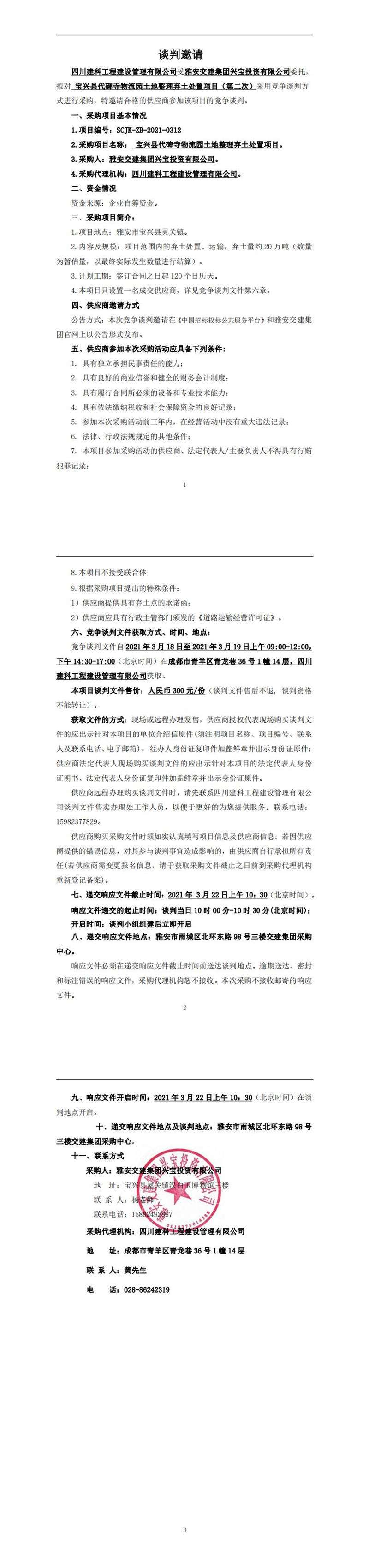 米兰体育-米兰(中国)官网 兴宝投资有限公司宝兴县代碑寺物流园土地整理弃土处置项目(第二次)竞争谈判公告