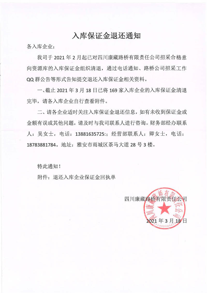 四川康藏路桥有限责任公司入库保证金退还通知