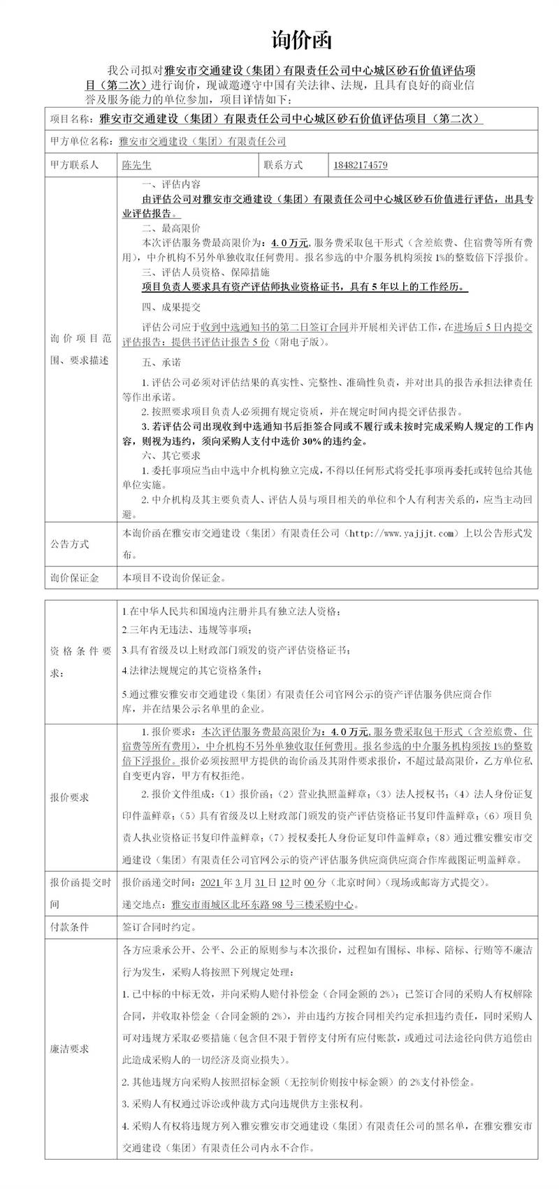 米兰体育-米兰(中国)官网 中心城区砂石价值评估项目(第二次)询价函