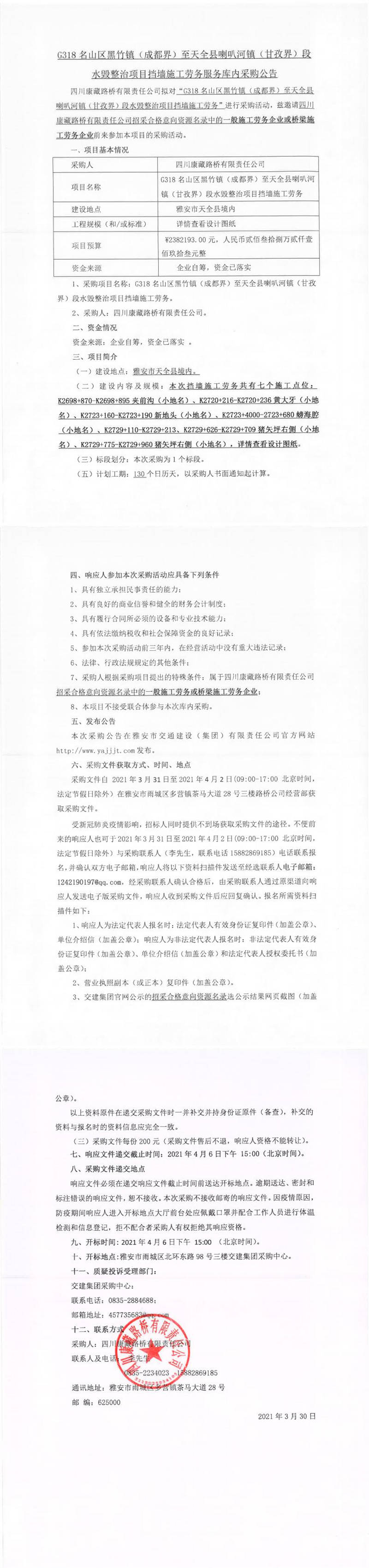 四川康藏路桥有限责任公司G318名山区黑竹镇(成都界)至天全县喇叭河镇(甘孜界)段水毁整治项目挡墙施工劳务服务库内采购公告