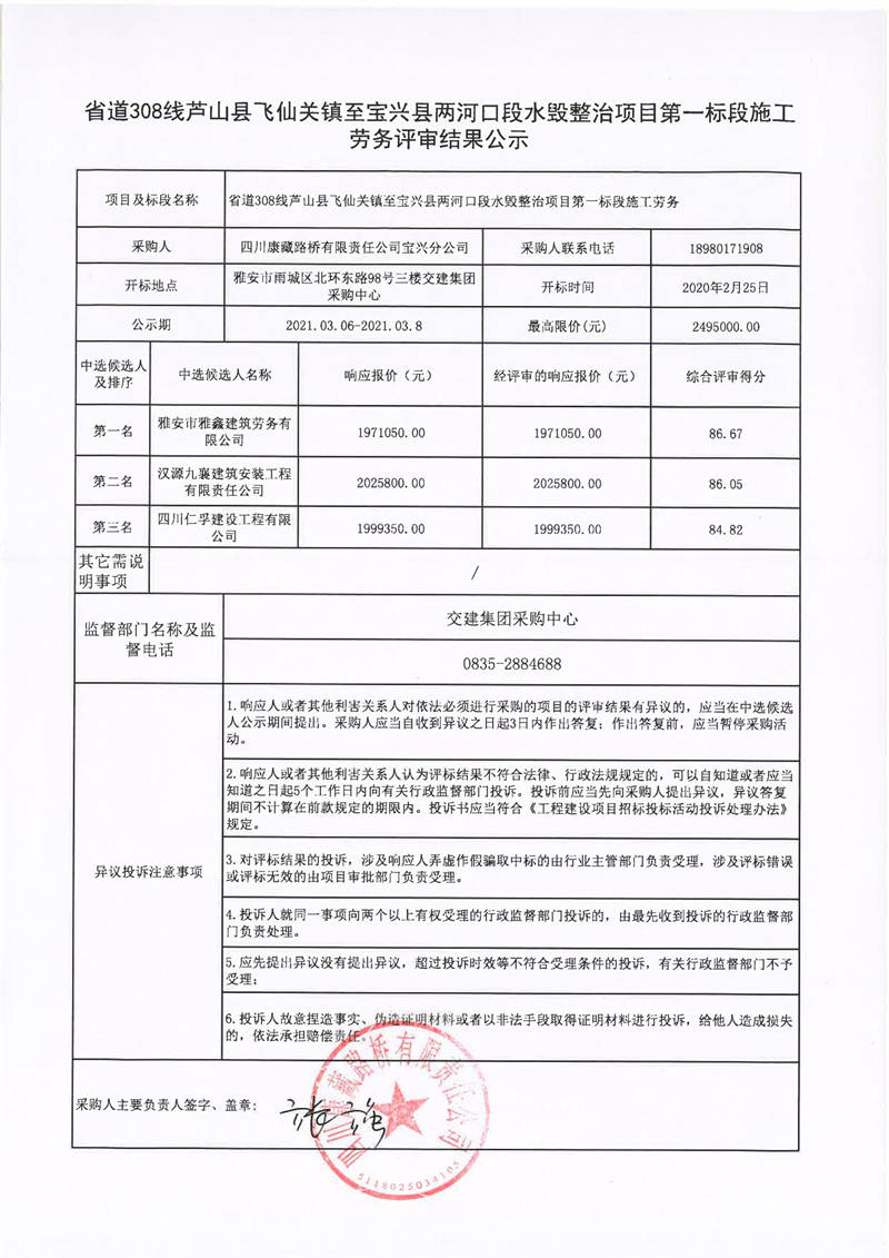 四川康藏路桥有限责任公司宝兴分公司省道308线芦山县飞仙关镇至宝兴县两河口段水毁整治项目第一标段施工劳务评审结果公示
