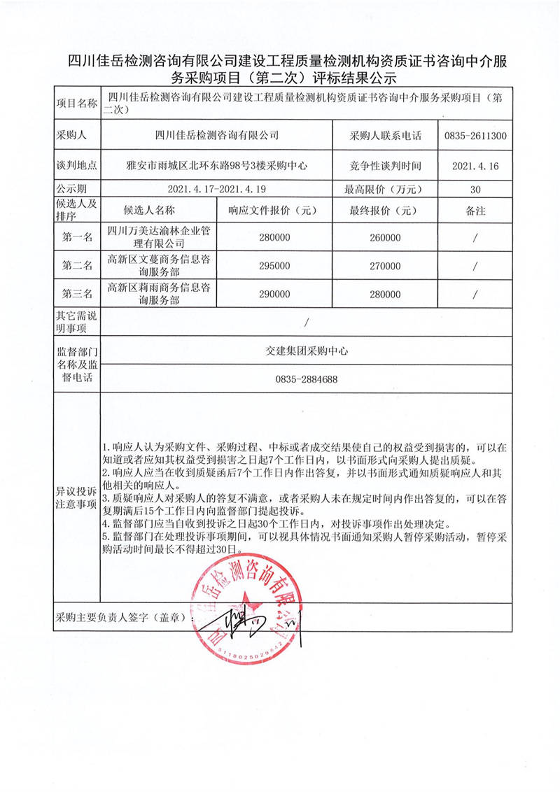 四川佳岳检测咨询有限公司建设工程质量检测机构资质证书咨询中介服务采购项目(第二次)评标结果公示