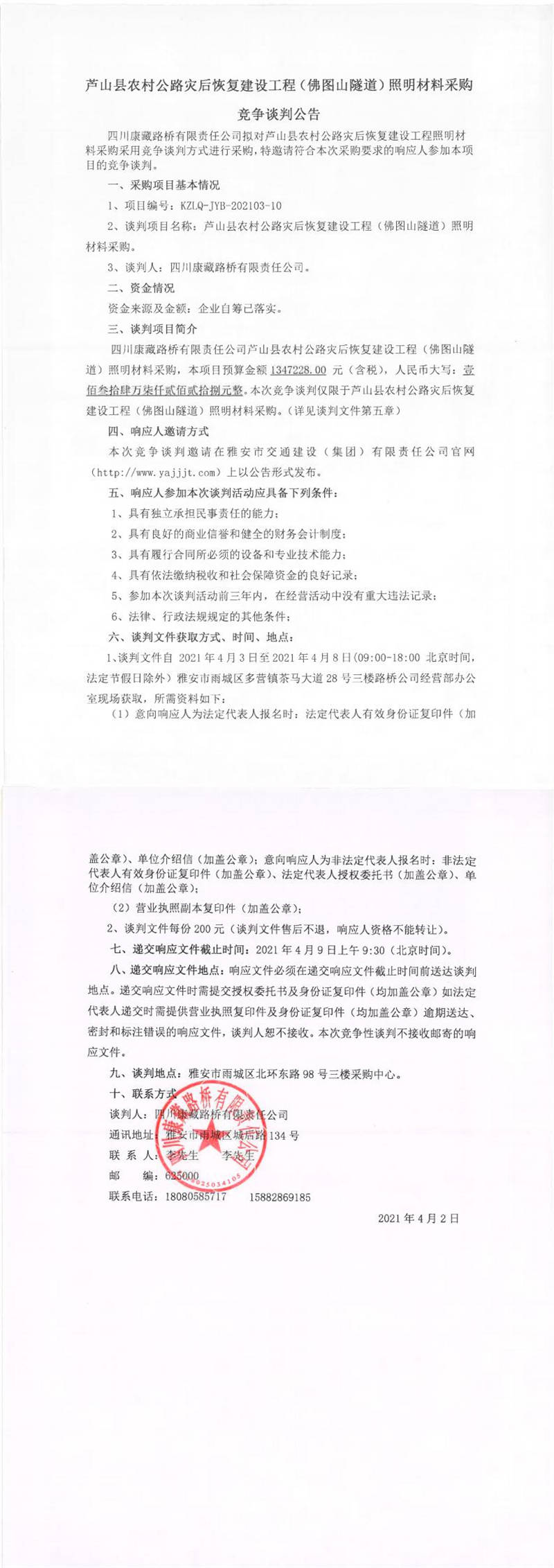 四川康藏路桥有限责任公司芦山县农村公路灾后恢复建设工程(佛图山隧道)照明材料采购竞争谈判公告