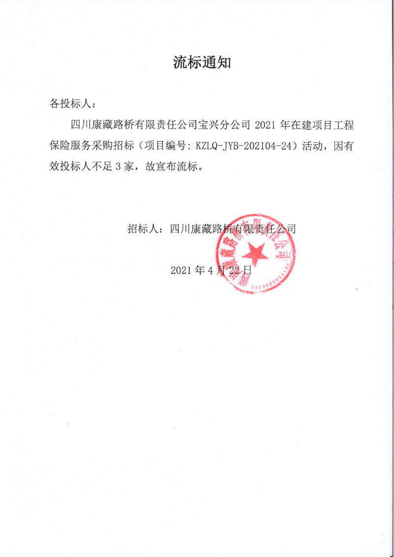 四川康藏路桥有限责任公司宝兴分公司2021年在建项目工程保险服务采购流标通知