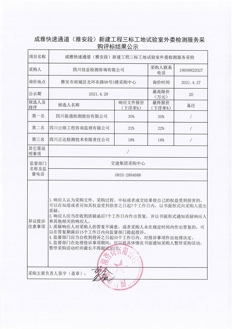 四川佳岳检测咨询有限公司成雅快速通道(雅安段)新建工程三标工地试验室外委检测服务采购评标结果公示