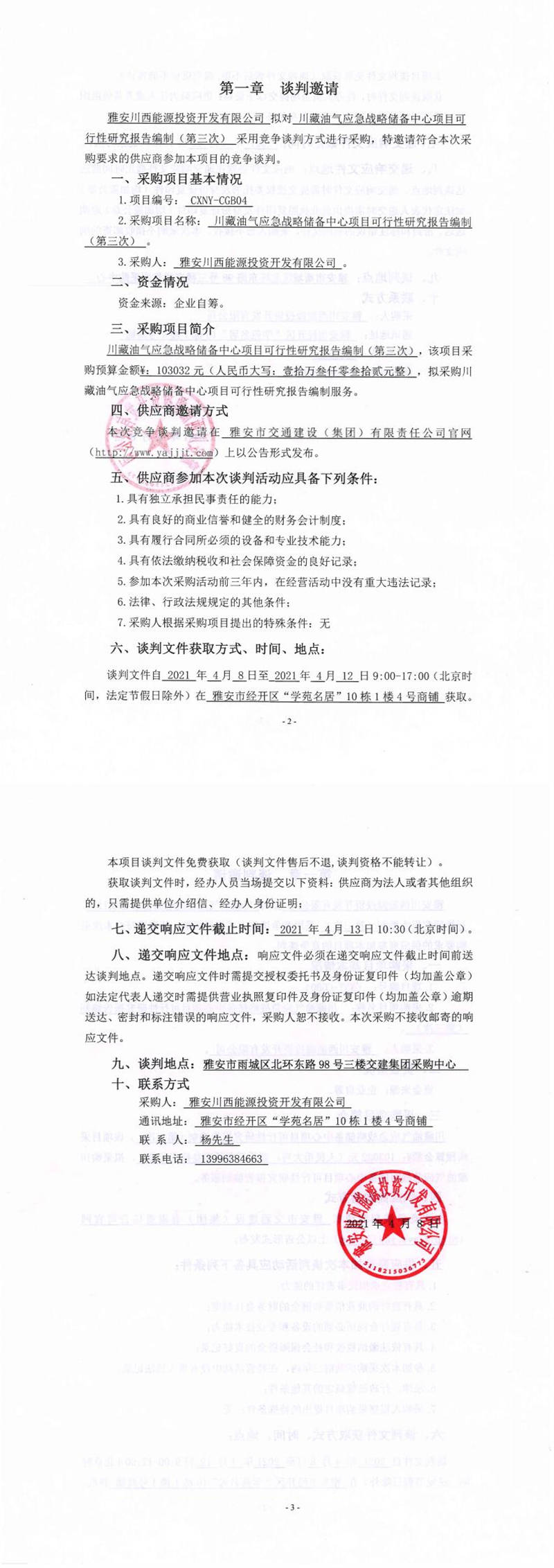 雅安川西能源投资开发有限公司川藏油气应急战略储备中心项目可行性研究报告编制(第三次)竞争谈判公告