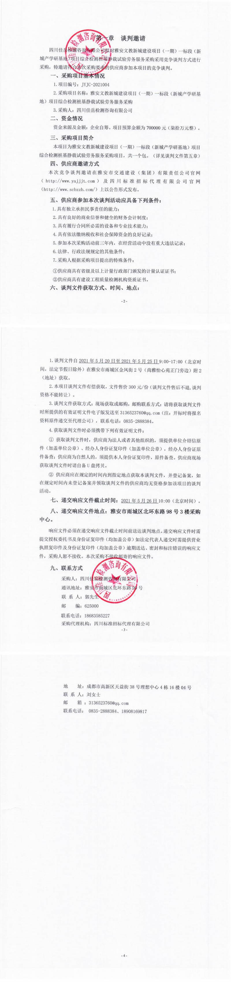 四川佳岳检测咨询有限公司雅安文教新城建设项目(一期)一标段(新城产学研基地)项目综合检测桩基静载试验劳务服务竞争谈判公告