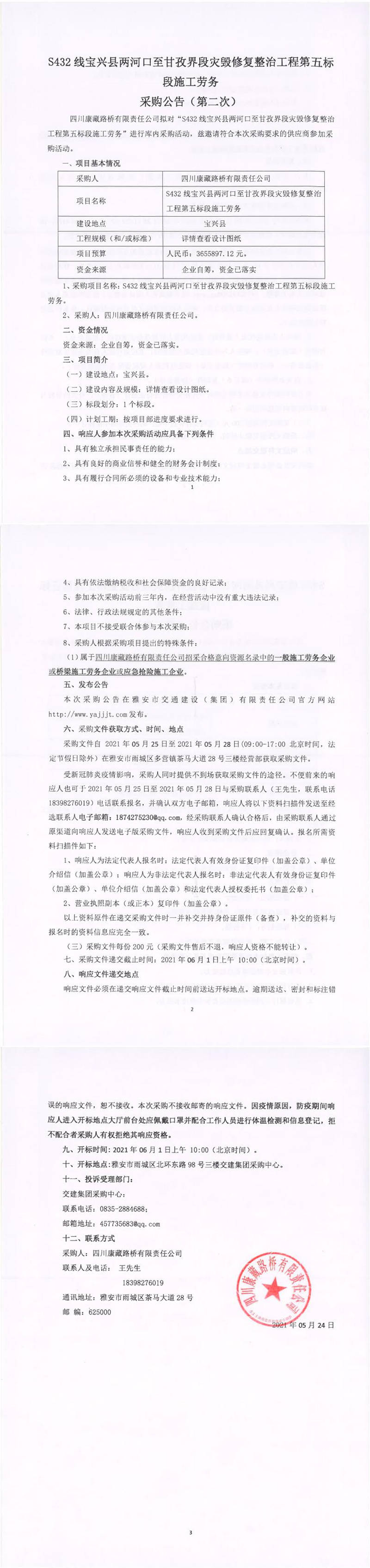 四川康藏路桥有限责任公司S432线宝兴县两河口至甘孜界段灾毁修复整治工程第五标段施工劳务采购公告(第二次)