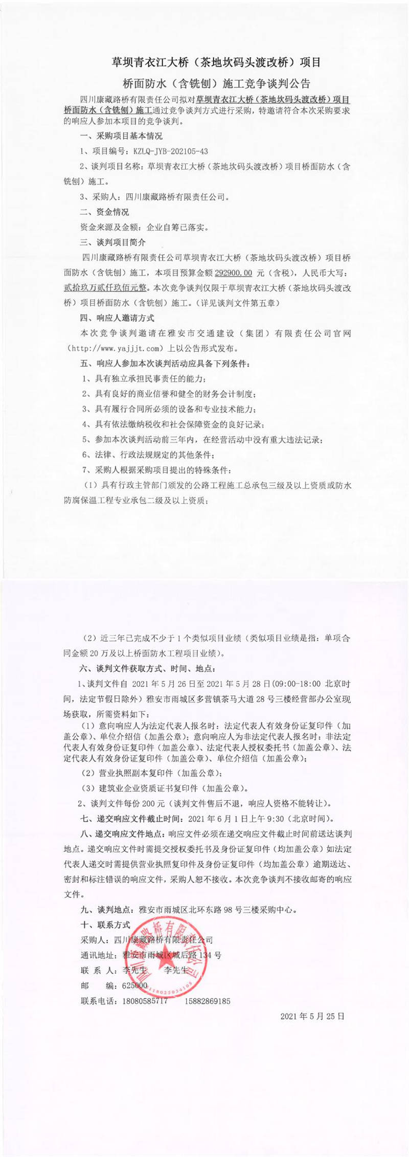 四川康藏路桥有限责任公司草坝青衣江大桥(茶地坎码头渡改桥)项目桥面防水(含铣刨)施工竞争谈判公告