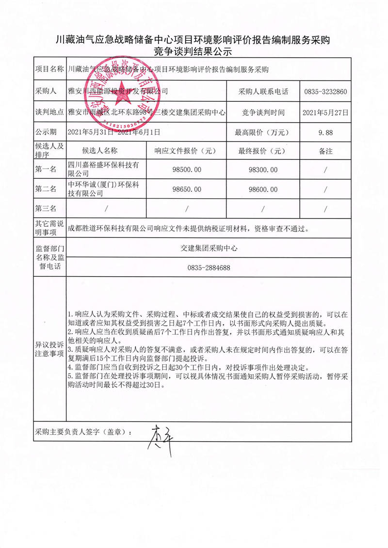 雅安川西能源投资开发有限公司川藏油气应急战略储备中心项目环境影响评价报告编制服务采购竞争性谈判结果公示