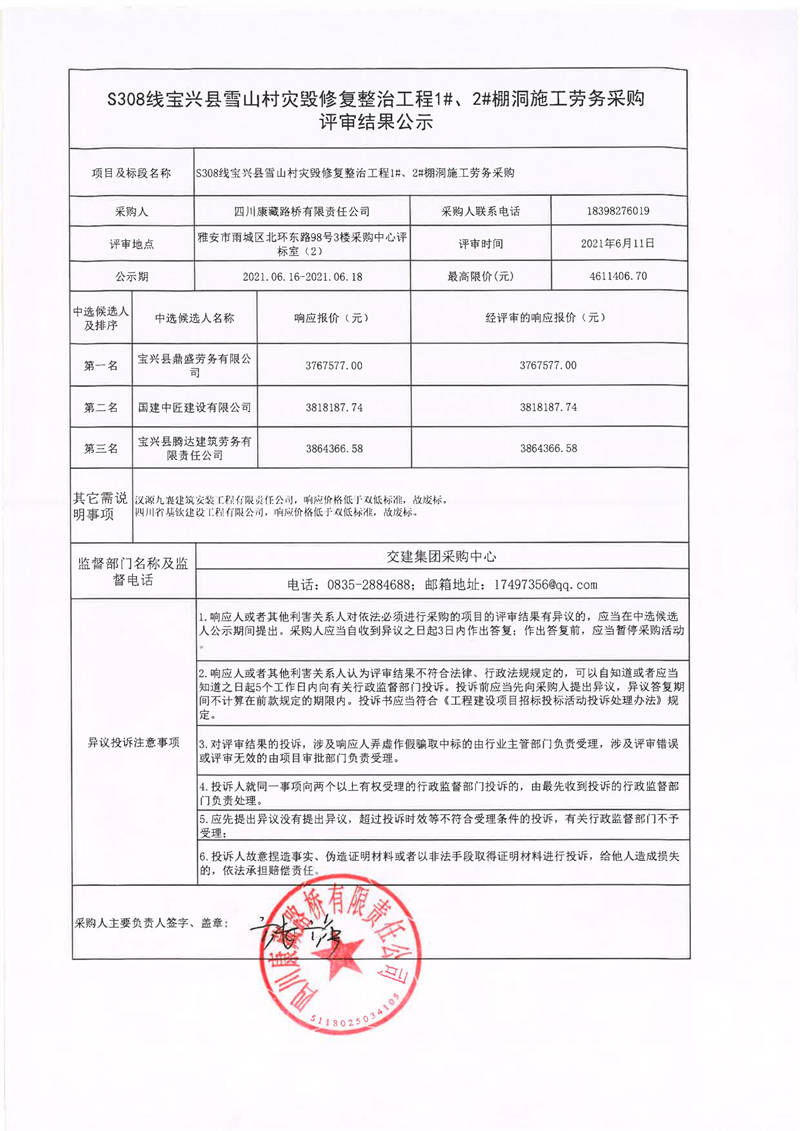 四川康藏路桥有限责任公司S308线宝兴县雪山村灾毁修复整治工程1#、2#棚洞施工劳务采购评审结果公示