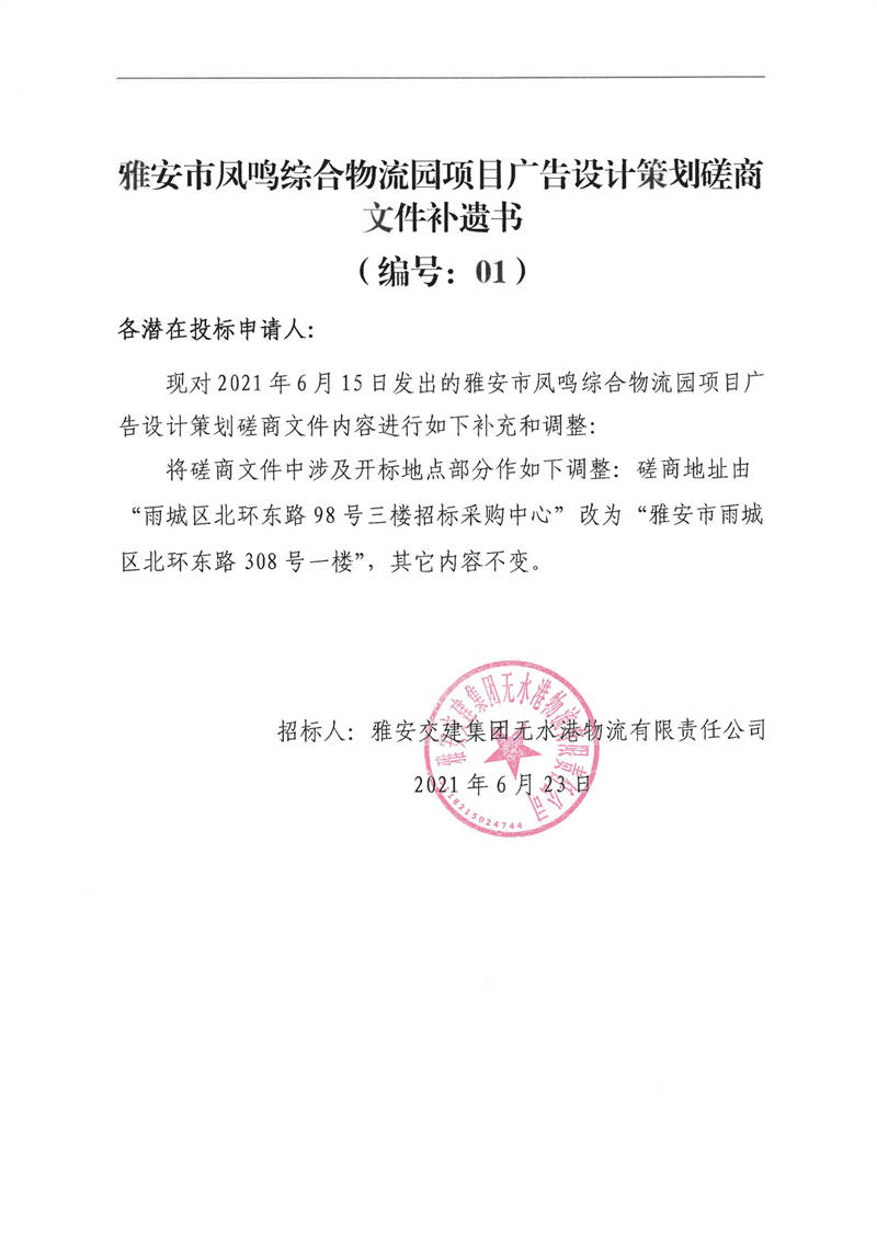 米兰体育-米兰(中国)官网 无水港物流有限责任公司雅安市凤鸣综合物流园项目广告设计策划磋商文件补遗书