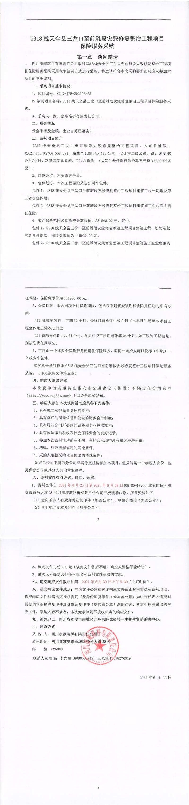 四川康藏路桥有限责任公司G318线天全县三岔口至前雕段灾毁修复整治工程项目保险服务采购竞争谈判公告