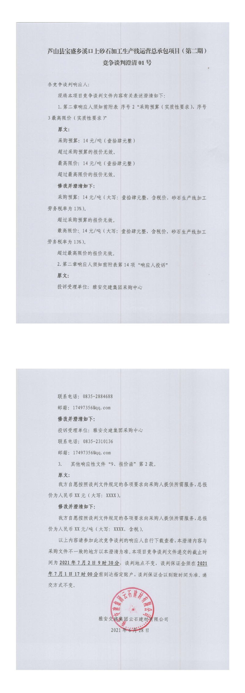 米兰体育-米兰(中国)官网 云石建材有限公司芦山县宝盛乡溪口上砂石加工生产线运营总承包项目(第二期)竞争谈判澄清公告