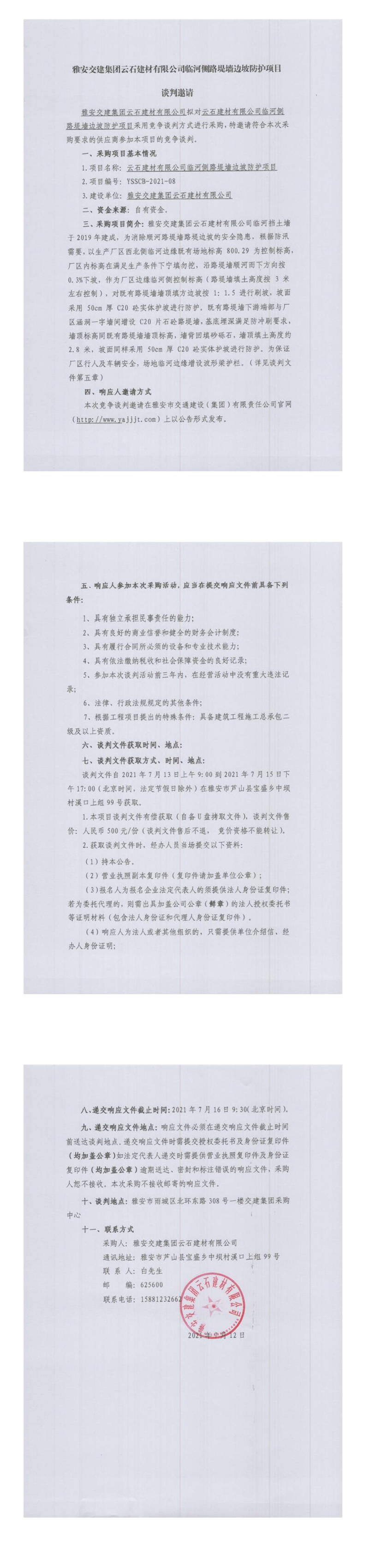 米兰体育-米兰(中国)官网 云石建材有限公司临河侧路堤墙边坡防护项目竞争谈判公告