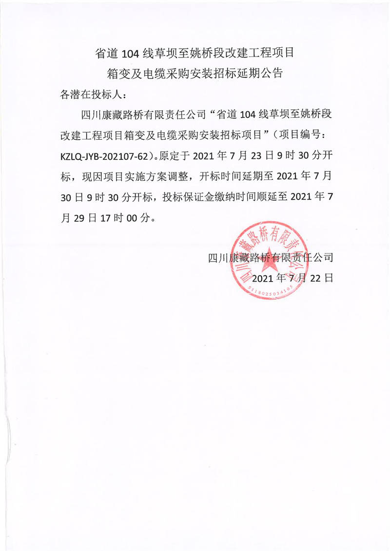 四川康藏路桥有限责任公司省道104线草坝至姚桥段改建项目箱变及电缆采购安装招标延期公告
